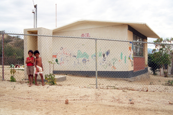突如として現れた日本人の集団を恥ずかしそうに見る子供たち。 後ろの建物の壁にはかわいい落書きが一杯してあった。